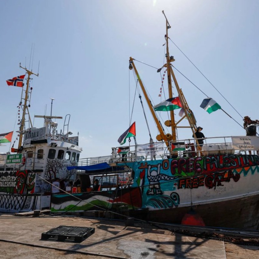 Konvoi yang terdiri dari 45 kapal dan lebih dari 500 relawan dari 45 negara itu memuat sejumlah tokoh internasional, termasuk aktivis lingkungan Swedia Greta Thunberg, cucu Nelson Mandela, serta anggota parlemen Eropa Rima Hassan.
