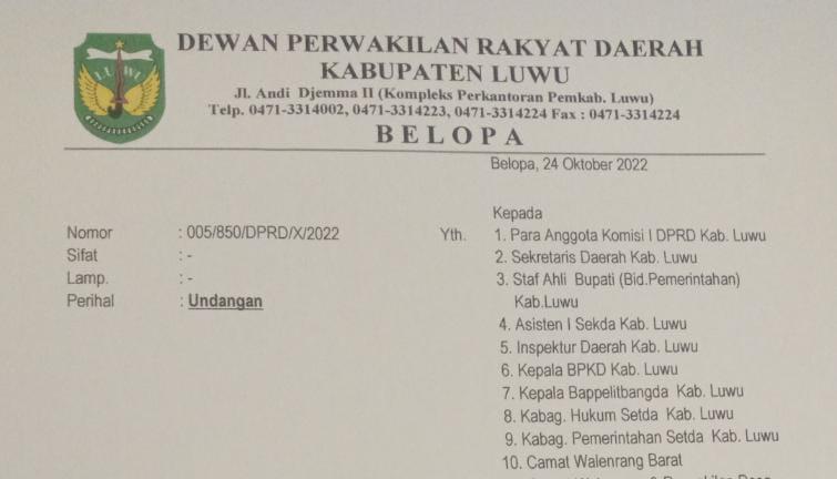 LUWU, Kapitanews.id — Berdasarkan nomor surat: 005/850/DPRD/X/2022 yang dikeluarkan oleh Dewan Perwakilan Rakyat Daerah (DPRD) Kabupaten Luwu untuk Rapat Dengar Pendapat (RDP) tentang Daerah Otonomi Baru (DOB) Luwu Tengah.