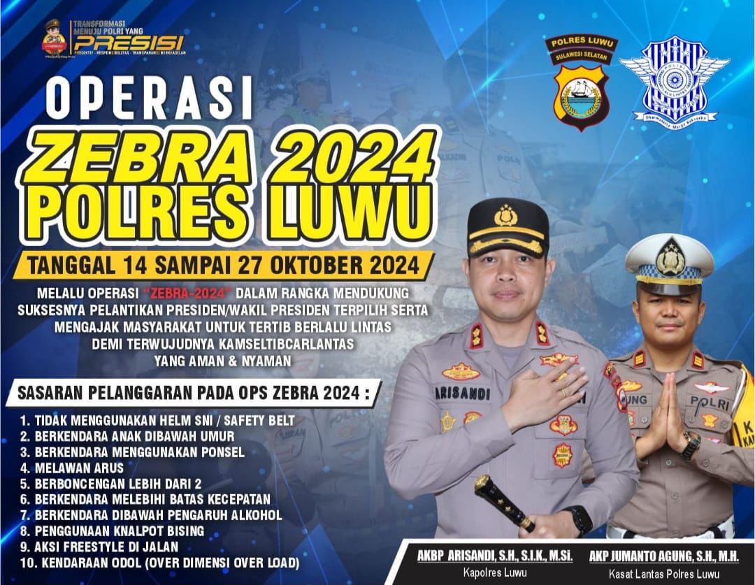 LUWU, Kapitanews.com – Satuan Lalu Lintas (Satlantas) Polres Luwu resmi menggelar Operasi Zebra Pallawa 2024 yang berlangsung dari 14 hingga 27 Oktober 2024.