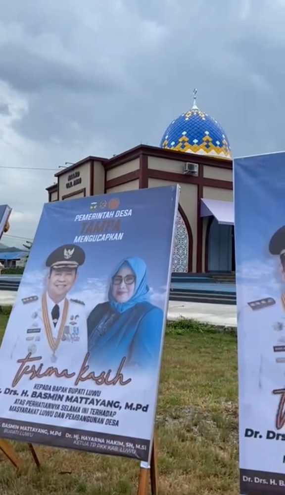 Baliho tersebut bertuliskan, ucapan terimakasih kepada Bupati Luwu, Basmin Mattayang dan Ketua PKK Luwu, Hayarna Hakim atas perhatiannya kepada masyarakat dan desa. Suasana itu terlihat ketika sedang berlangsungnya pengukuhan secara simbolis, penggunaan Nomor Induk Perangkat Desa se-Kabupaten Luwu di aula rumah jabatan Bupati Luwu, Kelurahan Pammanu Kecamatan Belopa, Rabu (7/2/2024).