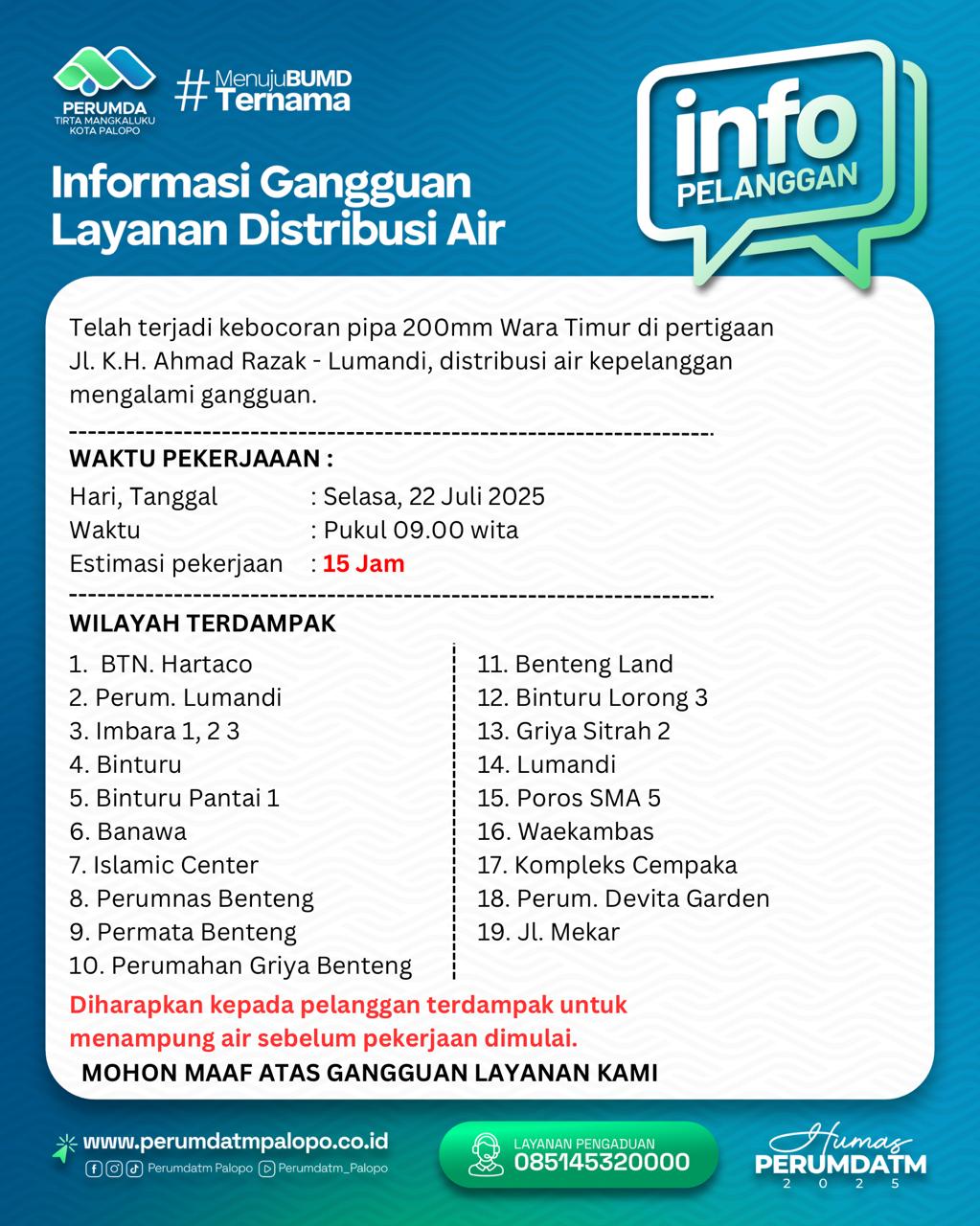 Pihak Perumda Tirta Mangkaluku mengimbau kepada seluruh pelanggan di wilayah terdampak agar menampung air secukupnya sebelum pekerjaan perbaikan dimulai.