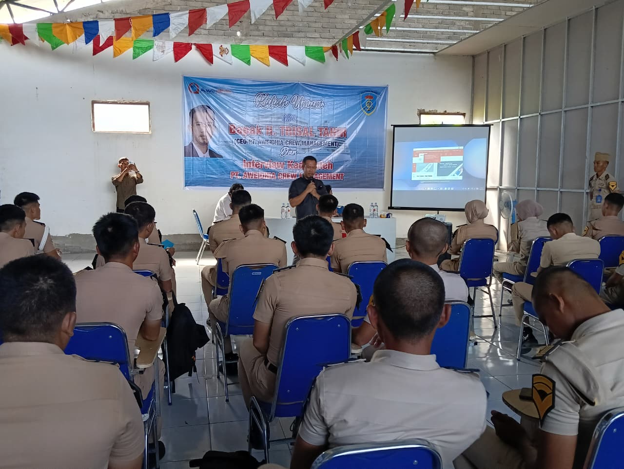 Mengawali kuliah umum, Trisal membakar semangat taruna dengan yel-yel khas dunia pelaut. Saat Trisal meneriakkan kata “pelaut”, para taruna serempak menjawab, “Jaya, jaya, jaya.”