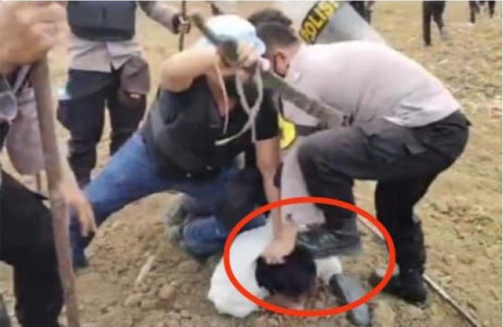 Dalam video tersebut terlihat salah satu anggota kepolisian menginjak kepala seorang petani yang diamankan karena membawa senjata tajam.